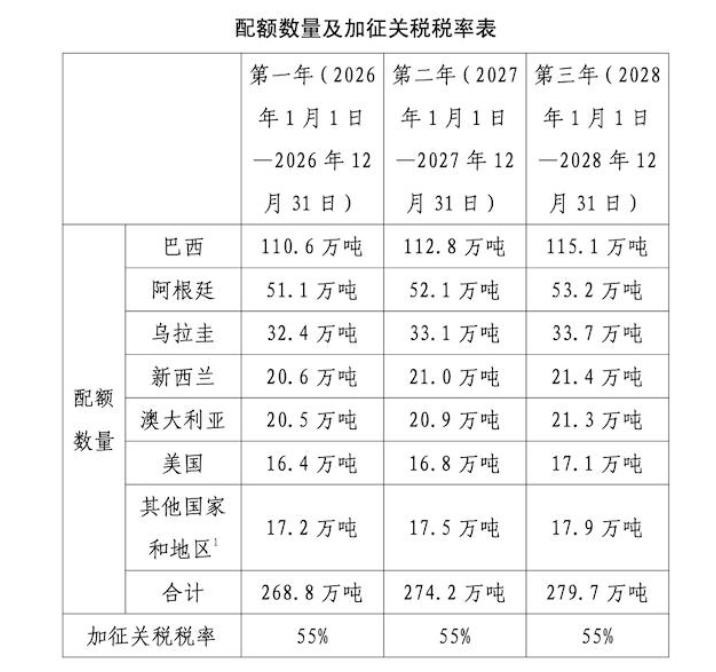 这次的保障措施细节很明确,2026年的总进口配额定在270万吨,其中巴西分到110.6万吨,阿根廷51.1万吨,澳大利亚20.5万吨,美国16.4万吨。